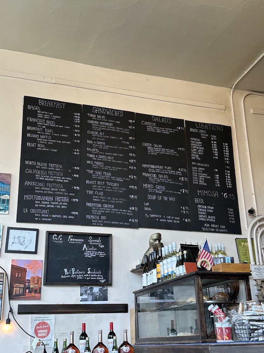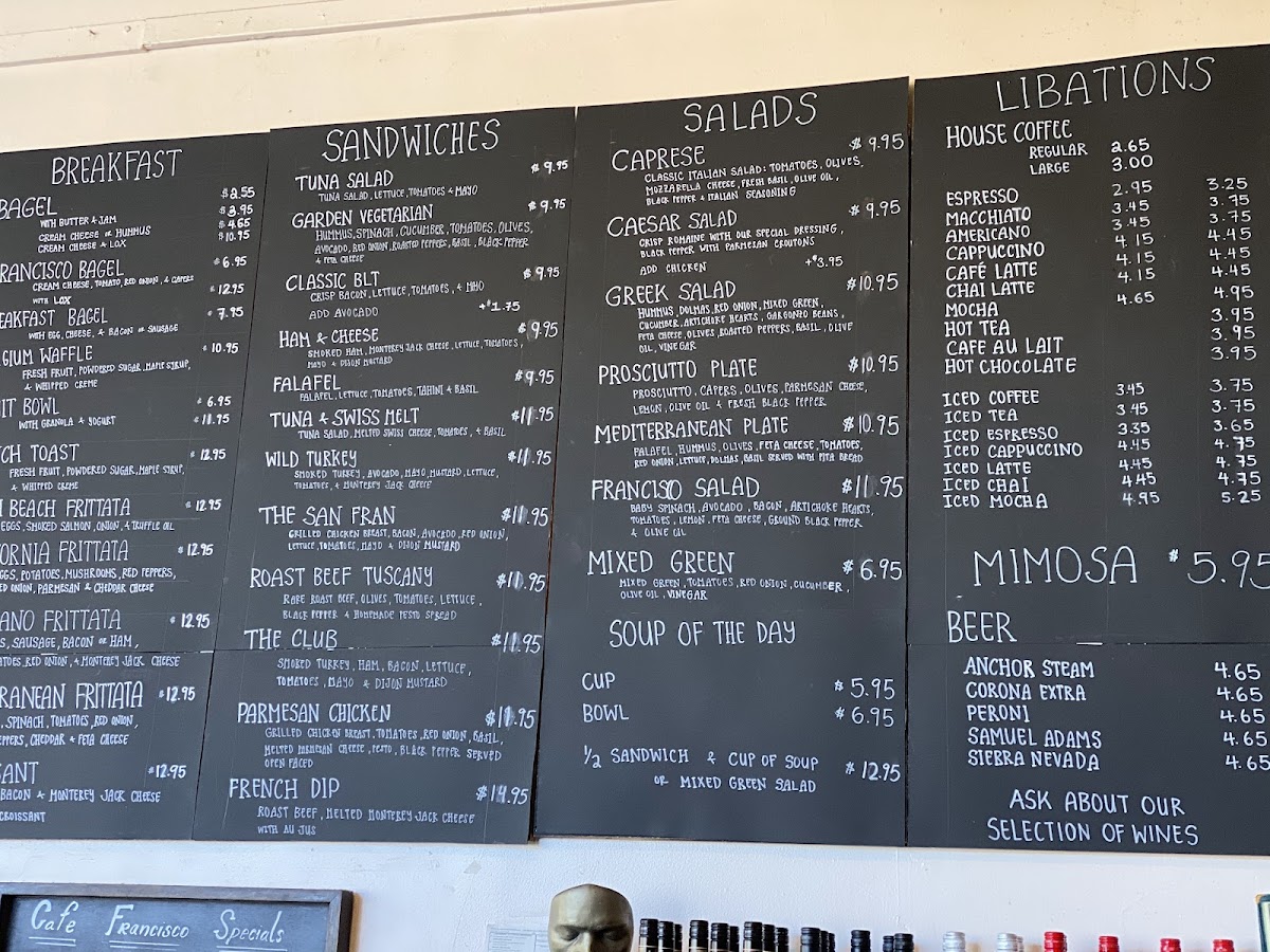 - Breakfast and Light Meals: Items include breakfast bagels with egg, cheese, and bacon; avocado toast; French toast; Mediterranean frittata; and the signature Francisco bagel and lox.